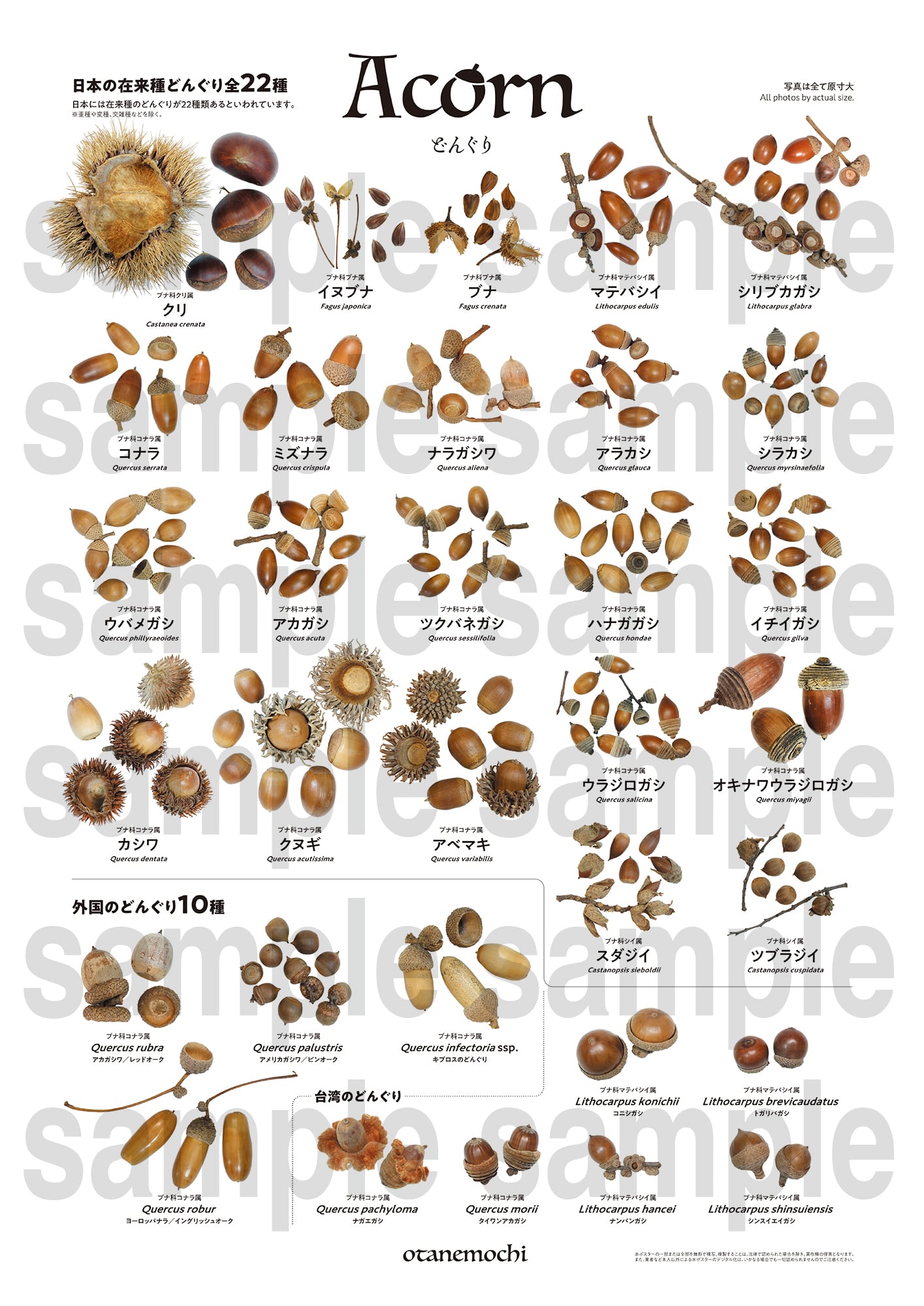 日本の在来種どんぐりは22種※あるとされています。その全22種類のどんぐりを原寸大で掲載したB2ポスターです。どんぐりの個体差がわかるところも注目ポイント。さらに外国産どんぐり10種も掲載。全部で32種のどんぐりが原寸大で掲載されています。